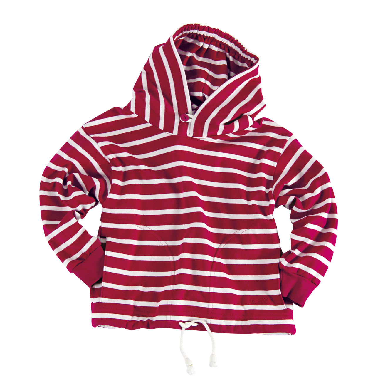 - bis Gr. 140 ersetzt aus Sicherheitsgründen ein elastischer Gummizug und ein Knopf mit Schlaufe den Kordelzug in der Kapuze. (225 g/m²)
